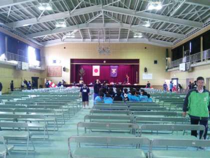 体育館では、会場準備がかなり進んできました。椅子が美しく並べられ、紅白の幕がかかられました。あとは、生花の準備と最終仕上げを行うのみとなりました。