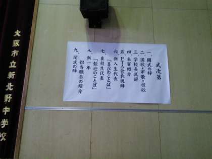 舞台に向かって、右側には入学式の次第が掲示されています。