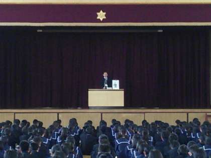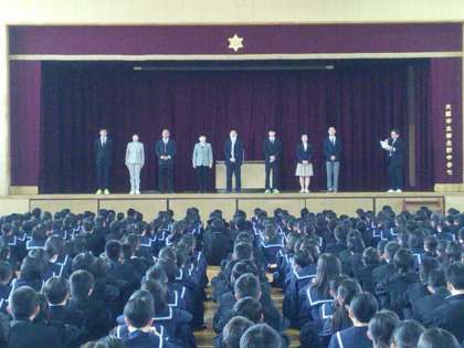 一旦、生徒の皆さんは教室に入り、荷物をおきました。体育館内では、着任式を行いました。新しく転任された教職員の皆さんを紹介しました。新たな出会いの場面です。