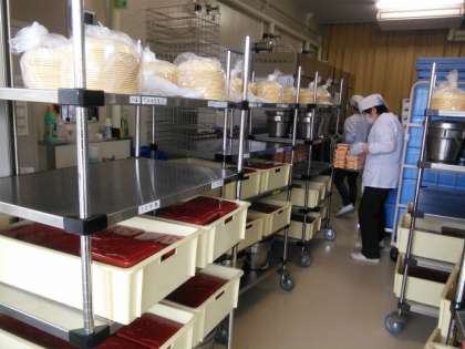 本日から、全員喫食が始まりました。今までは、2学年の喫食だったので、まだゆとりがありましたが、全員喫食となると、配膳室はワゴンだらけで狭い空間になっています。その中で、配膳員さんたちは作業を行っています。
