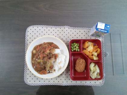 今日の給食は、カレーライス、一口かつ、枝豆、キャベツのピクルス、フルーツミックスでした。1年生の感想です。「カツが少し硬いです」「まだましな方ではないですか」