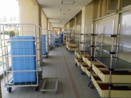 食事後の配膳室前の廊下の状況です。配膳用のワゴンが9台、運搬用のワゴンが6台、合計15台のワゴンが廊下に置いてあります。配膳室が狭いので、室内で作業ができないのです。課題ですね。