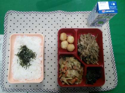 次の写真は、本日の給食です。おかずは、鶏ごぼうご飯、ツナと野菜の炒めもの、揚げポテトもち、ホウレン草のおひたしです。大人にとっては、少々味が濃かったような気がします。