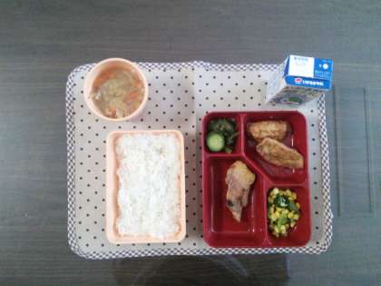 本日の給食は、赤魚の中華焼き、揚げギョーザ、チンゲンサイとコーンの炒めもの、茎わかめときゅうりの酢のもの、五目スープでした。