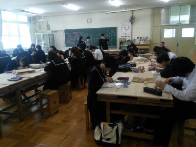 美術では、版画のための原画を描いている人、すでに彫刻刀を使用して彫り始めているひと等、その進度についてはばらつきがあります。しかし、けがをしないように、慎重に彫り進めている姿が印象的です。