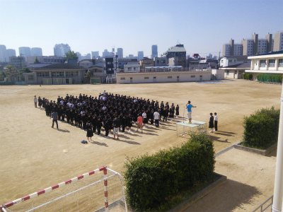 グラウンドでは、1年生の学年集会が行われました。8時25分には、整列が完了していました。生徒会の目標である『5分前行動』がきっちりと行えています。