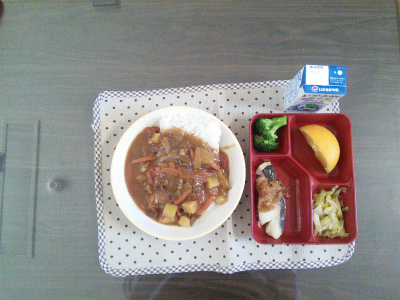 本日の給食は、ビーフカレーライス、ブロッコリー、白身魚のムニエル、キャベツのドレッシングあえ、オレンジでした。カレーは、人気メニューの一つです。おかわりをもらっている人もいました。