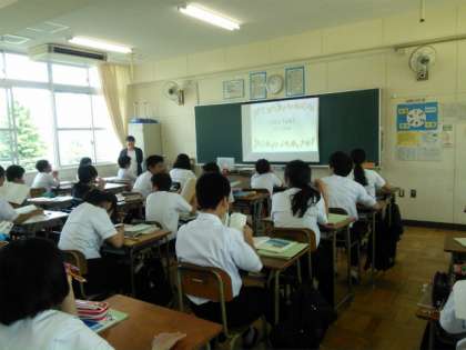 写真は、2年3組の英語の授業です。プロジェクターを使って視覚に訴える授業をしています。
