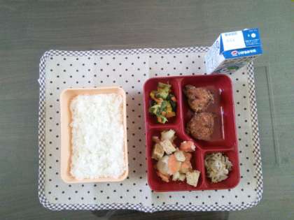 本日の給食は、鶏肉の竜田揚げ、あつあげとじゃがいもの煮物、野菜の炒めもの、もやしの酢の物です。生徒の皆さんの反応はどうでしょうか?