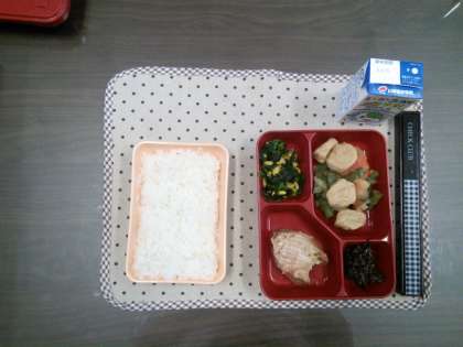 給食は、一口がんもとジャガイモの煮物、鰹の醤油マヨネーズ焼き、ホウレン草とコーンのおひたし、牛ひじきそぼろでした。鰹は、少し硬くどうしてもパサパサ感が残りました。また、コーンは一粒一粒がばらばらのため、おはしで食べることが手間になっているようでした。