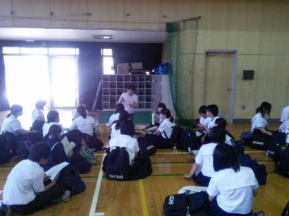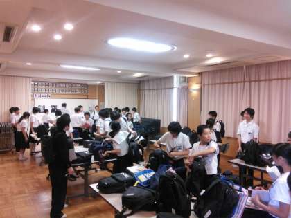 ごあいさつに行く前に、各自の荷物を1階の多目的室に置き、出発します。