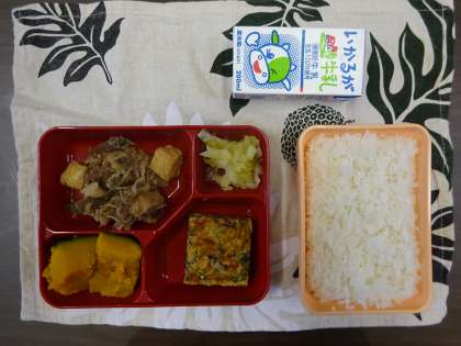 6月14日 本日、1年生が食べている給食です。今日のお味は、どうかな?すき焼き煮でした。