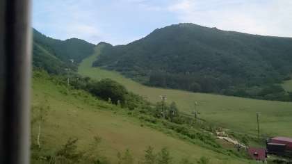 皆さん、おはようございます。修学旅行最終日の朝を迎えました。ホテルグリーンプラザ白馬の窓からの景色です。安全のため窓が半開きのため、枠が写ってしまいました。爽やかな山間部の朝です。