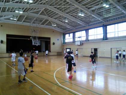 朝、体育館をのぞいてみると男子バスケットボール部の生徒たちが、シューティングの練習をしていました。この朝練では、1年生も上級生に交じって、シュートを打てるので、一生懸命練習していました。上級生のフォームをまねて自分のシュートフォームを作りあげているようでした。