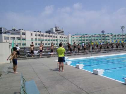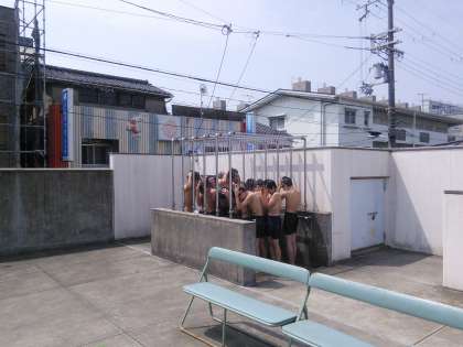1年生の男子は、水泳の授業が始まりました。プールサイドの観覧席でラジオ体操をしっかりと行いました。シャワーは、頭から足の先までしっかりと浴びました。