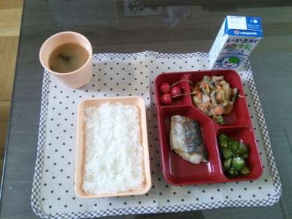 少し遅くなりましたが、17日(金)の給食です。この日は、さごしの塩焼き、鶏肉とじゃがいもの煮物、オクラの梅かか炒め、さくらんぼ、みそ汁でした。