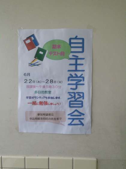 明日22日(水)から28日(火)までの期間、1階多目的室で放課後の時間帯(午後5時30分まで)に自主学習会を実施します。学校元気アップ事業の一環として行います。担任の先生に申込書を提出することが必要です。少しでも勉強する時間が増えれば、成績があがるかもしれません。もちろん、本人の努力次第ですが。しっかりと機会を利用しながら頑張ってほしいものです。