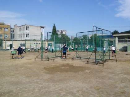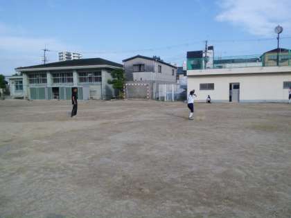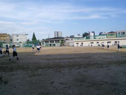 この日はグラウンドでは、ソフトボール部、野球部、陸上部、女子バスケットボール部が活動していました。ソフトボール部は、大阪市春季大会で優勝しました。次の夏の府大会に向けて一生懸命練習しています。3年生と1年生がペアを組みキャッチボールをしています。3年生が1球1球投げるたびに、「クラブの伝統」を下級生に「受け継いで」という思いが入っているようでした。