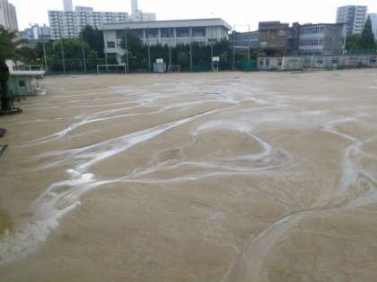 さて、梅雨に入り、雨が降るときには、とても激しく降ります。北中のグラウンドは結構水はけがよいのですが、グラウンドにたまった水が側溝に向かって思い思いの川を作りながら流れていきます。このため、グラウンドの表面にかなり大きな凸凹ができてしまいます。なんとかしたいのですが…。