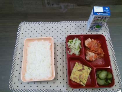 本日の給食は、鶏肉のトマトソース煮、スペイン風オムレツ、キャベツと枝豆のソテー、きゅうりのサラダです。緑、赤、黄といろどりが豊かで、見るからに食欲をそそります。食してみると、味も決して悪くなく、おいしくいただきました。やはり、第一印象はとても大切な気がします。