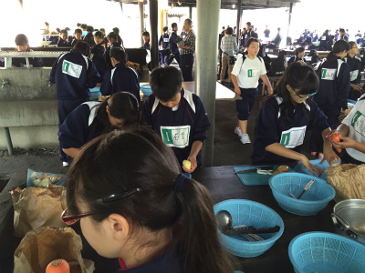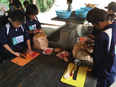 朝から降っていた雨もおさまり、野外炊飯が順調に行われています。作る料理は、カレーライスです。薪に火をつけることに、とても苦労したようです。また、薪から出てくる煙に涙が出てくることもありました。ようやくできたカレーライスは、とてもおいしかったそうです。