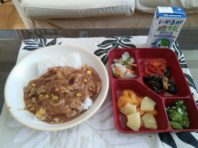 本日は、人気メニューの一つ、夏野菜のポークカレーライスです。まず、カレーのルーの上に、揚げ野菜とゆで野菜をトッピングします。あとは、キャベツのサラダとフルーツミックスが添えられています。