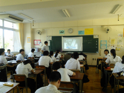 3年生の理科の授業のようすです。タブレット、プロジェクター、スクリーンを使って、映像を見せています。電池に関する教材を事前に準備しておきます。この映像を生徒たちは興味深く見ています。