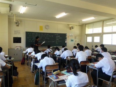 2年生の英語の授業です。interesting という単語について、発音・意味・使い方の説明を受けています。