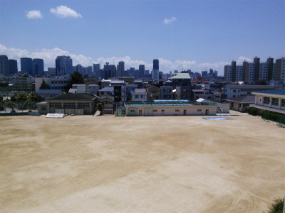 校舎から見たプールです。1年生が水泳の授業を受けています。外は気温が上がり、とても暑い日になりました。おそらくプールの水は、ぬるま湯のようになっているのではないでしょうか。