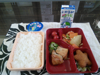 プチトマトとにんじんの赤色、オクラの緑色、星形コロッケのこんがりとしたきつね色と今回も彩(いろどり)は良いようです。鶏肉の照り焼きは、この形しかないのでしょうか。見栄えが少し…。