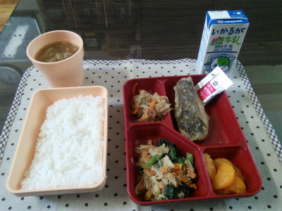 本日は、1学期最後の給食です。白身魚の唐揚げ、豚肉と野菜の炒めもの、切り干し大根の煮物、みかん缶詰、みそ汁でした。白身魚は、あっさりとしていて、食べやすかったです。切り干し大根の煮物も豚肉と野菜の炒めものは、しっかりと味つけされていました。おいしかったです。お醤油がついていましたが、結果的には何にかければよいのか、わかりませんでした。