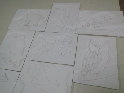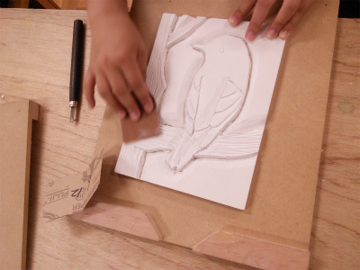 3年生の美術の授業のようすです。木彫の作業をしています。彫刻刀でけがをしないように、ていねいに彫っている人、彫ったところを紙やすりで研磨する人、先生に出来具合を見てもらっている人等、様々です。