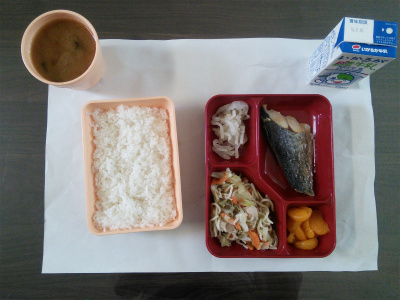 本日は、さごしの塩焼き、塩焼きそば、大根の酢の物、みかんの缶詰、みそ汁でした。見た目は、大根、焼きそばとも色は白く、淡白なイメージがありますが、味付けは、結構しっかりとしていました。おいしかったです。