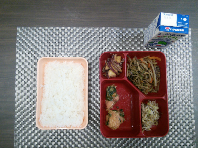 本日は、鶏肉の照り焼き、きんぴらごぼう、もやしときゅうりの酢の物、さつまいもの唐揚げです。今日は、どのような味付けでしょうか。テストで疲れた生徒の体を癒してくれるのでしょうか。楽しみです。