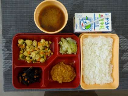 本日は、かつ丼、一口とんかつ、ひじきの煮もの、キャベツの即席づけ、みそ汁です。今日は、かつ丼。めずらしさが感じられました。