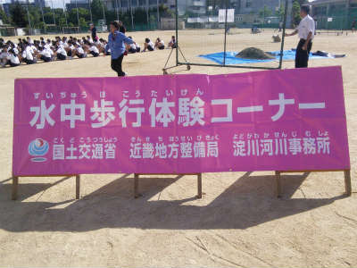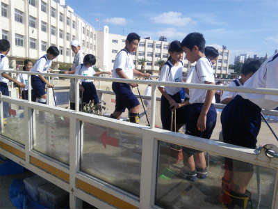「もし、マンホールから水があふれ出し、路面一帯が20〜30cmの水に覆われたらどうなるか」という、設定の下でこの体験を行いました。ブロックやがれきが水中に存在し、とても危険な状態になります。また、万一、マンホールのふたがはずれていたら、落とし穴のように落ちてしまうかもしれません。生徒たちは、長靴をはいて、つえを持って体験しました。