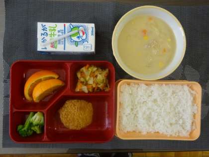 本日の給食は、クリームシチュウ、ブロッコリー、ミンチカツ、キャベツのドレッシング、オレンジでした。今日は、おいしかったです。クリームシチュウに人気がありました。