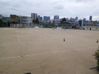 本校のグラウンドは、昨日は台風がもたらした雨のため、大きな水たまりができていましたが、今朝はほとんど乾いた状態まで戻っています。体育大会が30日に行われるため、生徒の練習も佳境に入ってきました。グラウンドでは、朝から体育科の先生が整地をしたり、ラインを引いたりと大忙しです。