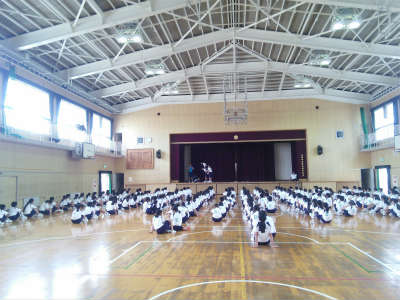 体育館では1,2時限目に1年生の学年競技「ローンレンジャー」の説明が行われています。生徒たちは、初めて見る(行う)競技に興味津々のようすで、先生のお話を聞いていました。