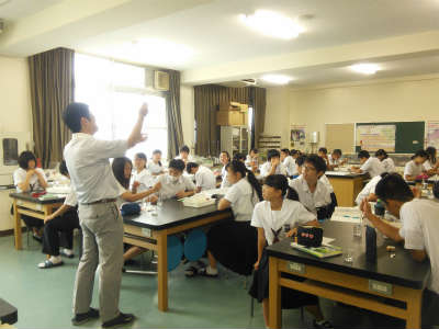 2時限目に、3年5組は理科の実験を行っていました。中和滴定の実験です。まずは、先生の説明を聞いて、駒込ピペットの扱い方の練習を行っていました。