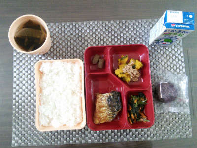 本日は、鯖のみそづけ焼き、かぼちゃのそぼろ煮、ホウレン草とニンジンのおひたし、こんにゃくの甘辛煮、すまし汁、おはぎです。