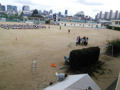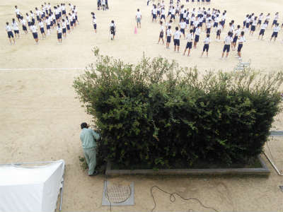生徒たちは、体育大会の練習を行っていますが、環境整備も並行して行っています。管理作業員さんがグラウンドの防砂林の剪定を行っています。「生徒たちには、少しでも良い環境の下で体育大会をしてもらいたい。保護者には、少しでも良い環境の下で体育大会を見てもらいたい」との思いを込めて、作業にあたっています。すべての人が一つの大きな行事を成功させようと努力をしています。