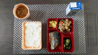 この日の給食は、さごしの塩焼き、鶏肉とじゃがいもの煮物、きゅうりとわかめの酢の物、パインアップル缶詰、みそ汁でした。