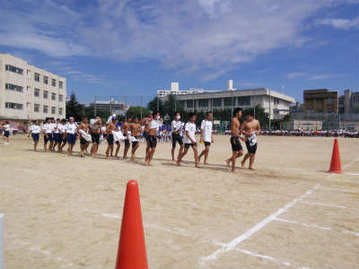 水泳部は、男子部員が本部前で突然、シャツを脱ぎました。一瞬、見ている人は驚きましたが、実は本来の水着姿になるためだったのです。
