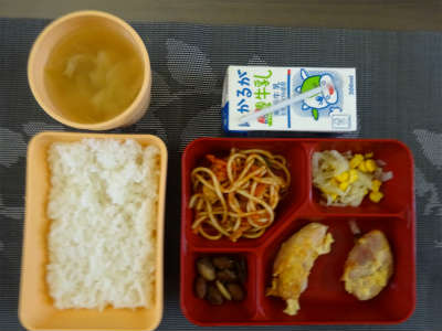 本日は、チキンピカタ、スパゲティナポリタン、ダイコンとコーンのサラダ、うづら豆のグラッセ、スープでした。チキンピカタはおいしいものでした。