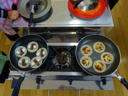 先週に引き続き、幼児のお菓子作り、「餃子の皮で簡単ピザ」作りです。