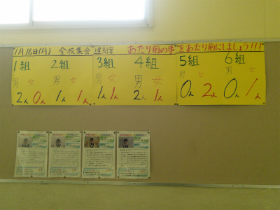 廊下には様々な掲示物があります。3年生の廊下には、集会での遅刻者数が掲示しています。「5分前行動を心がけ、一人も遅刻しないように頑張ろう!」と、生徒自身が考え決めたことを実践しようと頑張っています。次第に集会の状況も良いものになってきました。素晴らしいことですね。