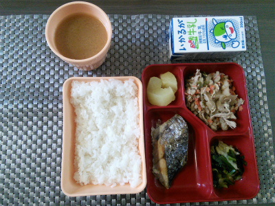 本日は、さごしの塩焼き、鶏肉とれんこんの炒めもの、きくなとはくさいのおひたし、りんごの缶詰、みそ汁でした。