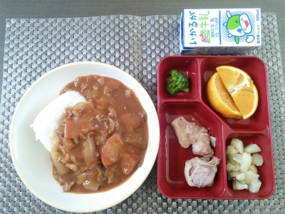 本日の給食は、ハヤシライス、ブロッコリー、チキンソテー、ジャガイモの洋風煮、デコポンでした。