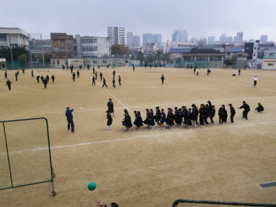 昨日の昼休みに、1年生のあるクラスは、大縄跳びの練習をしていました。体育科の先生も混じって、楽しそうに跳んでいます。